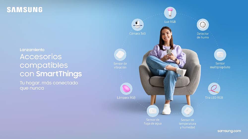HOY EN DÍA ES POSIBLE ADMINISTRAR EL HOGAR DESDE EL CELULAR Y POTENCIAR LAS RUTINAS COTIDIANAS. PARA CONTINUAR AMPLIANDO EL ECOSISTEMA DE PRODUCTOS COMPATIBLES CON SMARTTHINGS, SAMSUNG INCORPORA PRODUCTOS COMO LUCES, CÁMARAS, SENSORES DE AGUA Y DE MOVIMIENTO, Y BOTONES INTELIGENTES; EXPANDIENDO LA EXPERIENCIA DEL HOGAR AI.